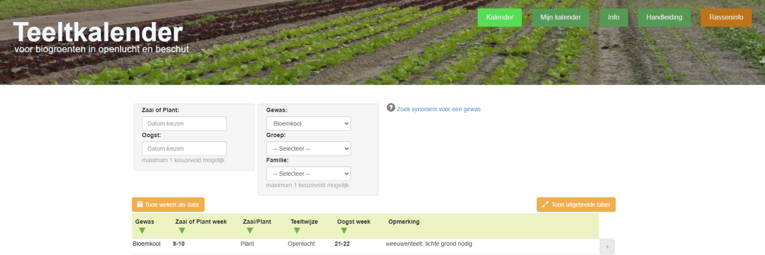 De online teeltkalender bestaat al sinds 2016 en werd toen samen met en voor de doelgroep van (kleine) biologische tuinbouwbedrijven opgesteld. Dankzij een extra project konden er in 2018 nieuwe functionaliteiten en een extra tool “rasseninfo” aan toegevoegd worden. De interne database van de teeltkalendergegevens kreeg begin dit jaar een update waardoor de gegevens sterk verbeterd en uitgebreid werden.