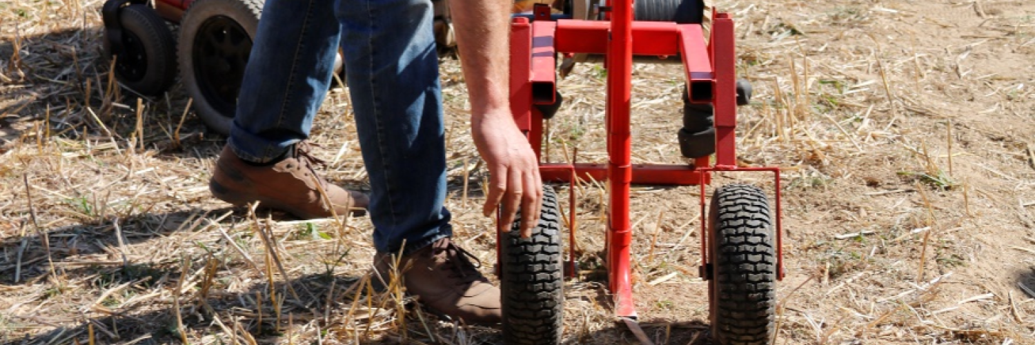 Luc Goemaere van De Grenshoeve is steeds op zoek naar optimalisatie van bestaande werktuigen of betaalbare alternatieven vinden van machines die reeds op de markt zijn. Geïnspireerd door de Luckoweeder van Bingenheimer maakte hij een heel licht schoffeltje mét lange steel geschikt voor fijn werk. Gedaan met op de knieën zitten, zwaar werk wordt lichter!