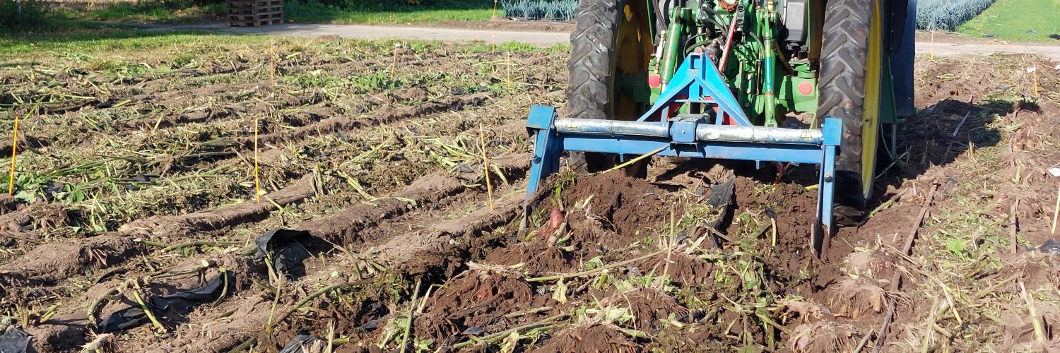 Naast de inzet van de oogstmachine is het ook belangrijk om te weten op welk tijdstip je het best oogst. Yacon is sterk vorstgevoelig en wordt daarom best vóór de eerste vorst geoogst. Bij vorst verkleurt het loof onmiddellijk zwart en kunnen de knollen vorstschade oplopen, wat absoluut vermeden moet worden. We oogstten yacon begin november. Bij Viaverda wordt het loof eerst verwijderd met een loofklapper met schijven (Baselier) en zijafvoer. Deze zijn goed voor het klapwerk. Extra schijven versnijden het loof bijkomend.